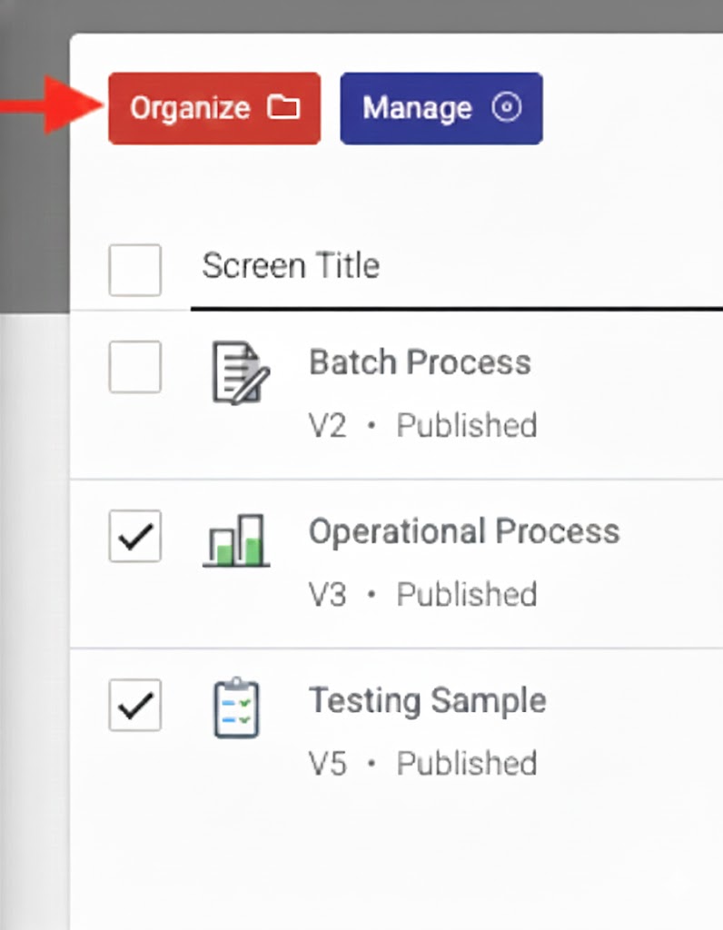 Folders are available on the web portal’s Screens, Docs, Data Sources, and Task Template listing pages. Adding these items to a Folder is the same for all, so we’ll use Screens as our example.