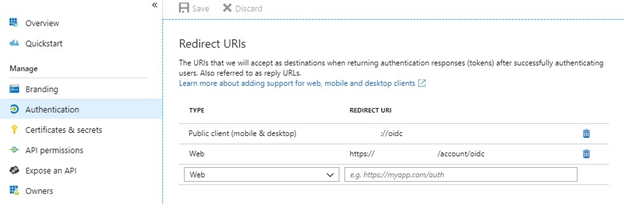 3. From the left pane select Authentication. In the Redirect URI's section, enter the two Redirect URI values found on your Organization Setup page into the forms below. The first Redirect Uri's type should be set to Public client (mobile & desktop). The second Redirect Uri's type should be set to Web.