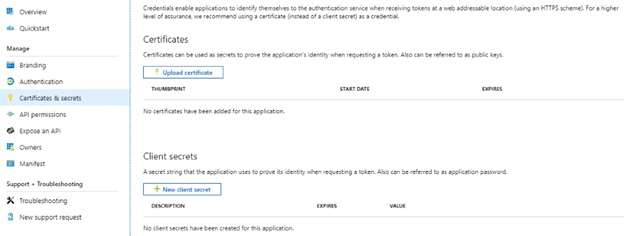 4. In the Certificated & Secrets section, Click on the New Client Secret button to add a new client secret.