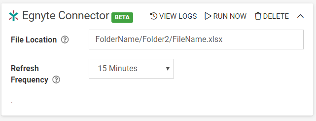 Navigating to Connected Data>Data Sources>Settings Page (of a data source)>Connector>ADD CONNECTOR+ and selecting the Egnyte option from the available list will add the Connector to that data source. Once the connector has ben added, enter the File's location (FolderName/Folder2/FileName.xlsx or .csv) and hit SAVE on the top right.