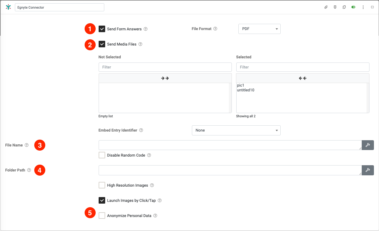 Exporting custom file outputs is achieved on form uploads by adding Form Connectors to the desired form. If you're looking to send/store multiple types of captured form data (e.g. customized PDFs, Word docs, Excel files) into your Egnyte account, the ability to add numerous Form Connectors to a form makes this possible.