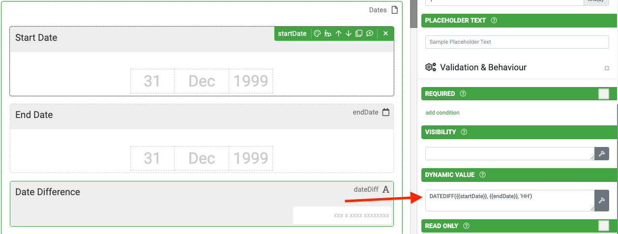 This is where the DATEDIFF() function comes in handy. It can be used in the Dynamic Value property of fields and calculates the difference between two dates.