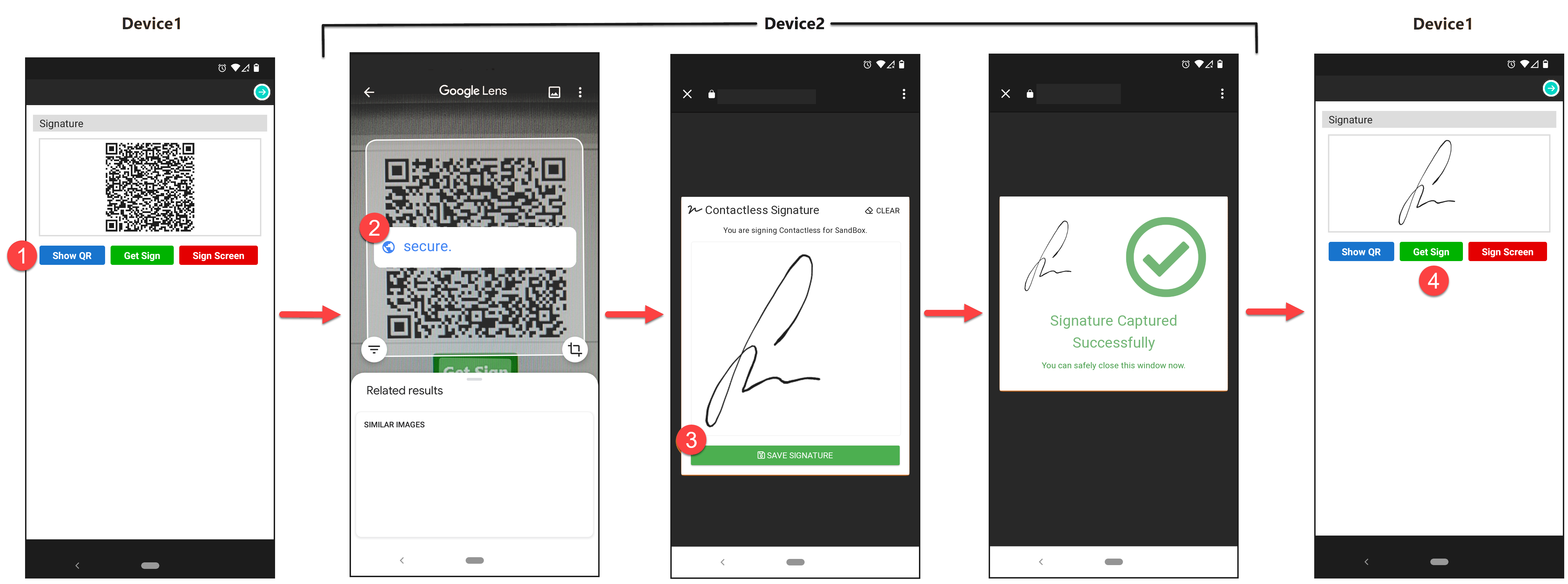The courier fills out a digital form, adds their signature and presents an in-app QR Code on their device for the receiver to scan using their own device. This launches the receiving device's native browser with a web-page allowing them to add their signature using their own device. The courier and receiver do not touch with the same device. Contactless!